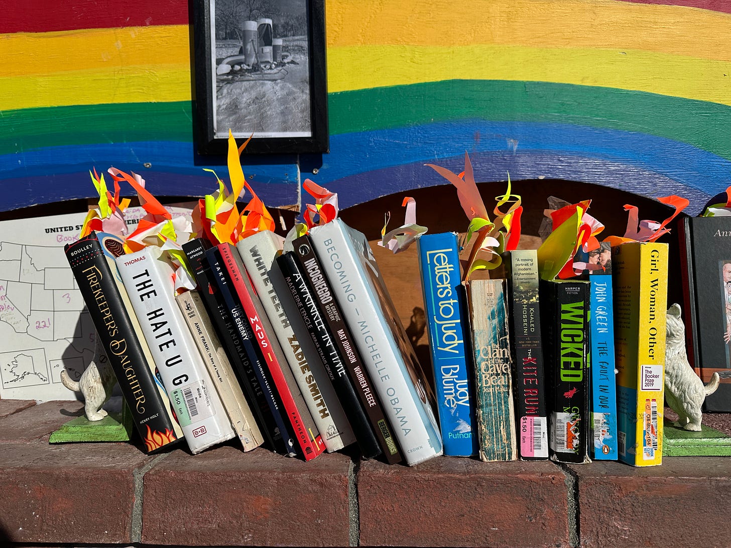 Banned Book Reading Room was like a mini library of banned books. The books were stuffed with an assortment of neon yellow, orange, and red pieces of paper, calling to mind a flame. I learned that Charlotte’s Web was a banned book1, because of the death and talking animals apparently.