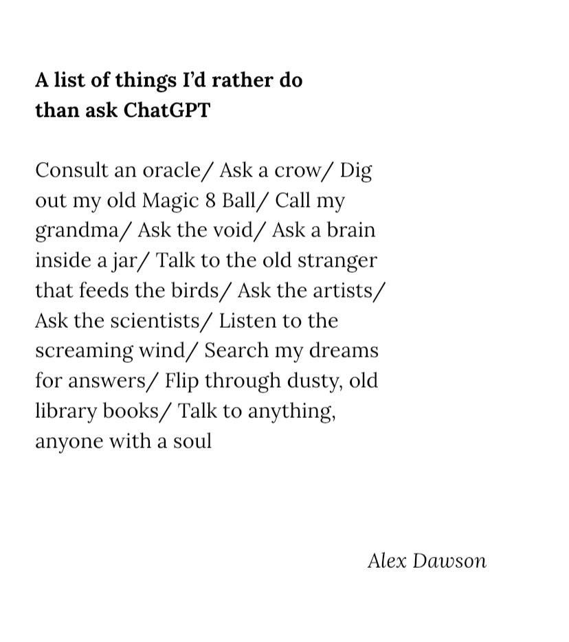 Like many others, I loved seeing Alex Dawson’s poem this week. If you like it, then go read her piece about the poem going viral: “Meanwhile, I am sitting here, giggling at the irony that a poem that is essentially about getting offline has fared so well online.”